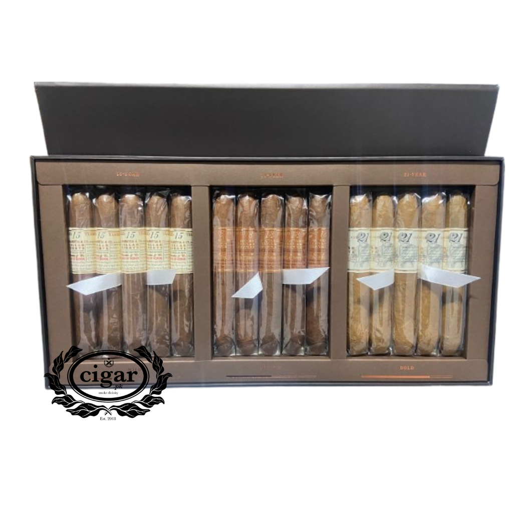 This exclusive set features 15 expertly aged cigars (15, 18 & 21 years), delivering rich flavor, smooth complexity, and timeless sophistication in every draw.